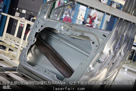 既然說到車門,順帶把車門的內(nei) 部結構圖片貼出。從(cong) 圖中不難看出,菲翔車門采用一體(ti) 成型,內(nei) 部附有兩(liang) 根加強杠。位於(yu) 上部分的偏窄的加強杠為(wei) 300Mpa,位於(yu) 下部分的顏色偏深的加強杠為(wei) 超高強度,厚度超過了2mm,強度達到了1300Mpa,是車身最高強度的鋼材之一。實際用手抬一下,分量十足!