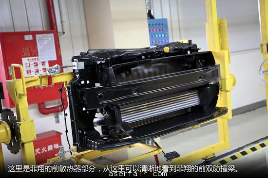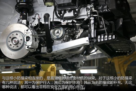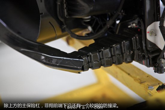 除上方的主保險杠,菲翔前端下沿還有一個(ge) 較細的防撞梁,與(yu) 這根小防撞梁相連接的,是高強度的鋁合金材質的縱梁。對於(yu) 這根小的防撞梁有幾種說法,其一為(wei) 保護行人;其二為(wei) 保護水箱;其三為(wei) 主防撞梁的補充。無論哪種說法,都可以看出菲翔在安全方麵的用心所在。