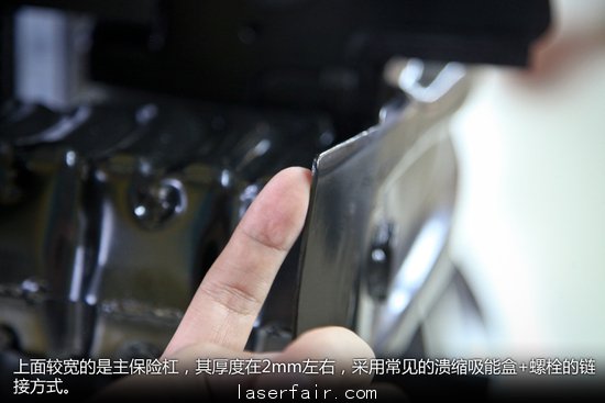 有了車身,下一步需要在車身上裝入懸架、發動機、內(nei) 飾等等部件,這也是最有看頭最容易看懂的地方。首先是網友所關(guan) 心的保險杠部分。從(cong) 拍攝的圖片來看,菲翔車前提供了兩(liang) 根防撞梁。上麵較寬的是主保險杠,其厚度在2mm左右,采用常見的潰縮吸能盒+螺栓的鏈接方式。從(cong) 之前拍攝的圖來看,尾部保險杠厚度同樣在2mm左右。