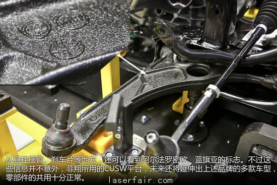除發動機外,首批量產(chan) 車型身上還有不少的“進口件”。從(cong) 懸掛擺臂、刹車片等地方,還可以看到阿爾法羅密歐、藍旗亞(ya) 的標誌。不過這些信息並不意外,菲翔所用的CUSW平台,未來還將延伸出上述品牌的多款車型,零部件的共用十分正常。