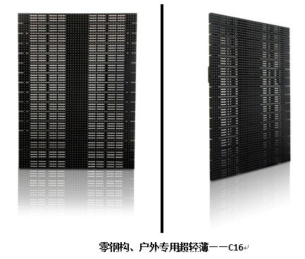 而C16是一款戶外固裝LED顯示屏,可直接替換傳(chuan) 統噴繪廣告牌,無需更換鋼結構。20kg/箱體(ti) ,最薄處32mm,屏體(ti) 重量降低32%;IP65/IP65高防護等級,實現戶外裸裝;透風透光設計,滿足高層建築樓頂樓麵廣告牌的不同需求;無風扇,無空調,自行散熱,節省成本和運營費用20%以上。