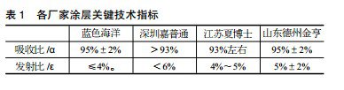 藍色海洋、深圳嘉普通、江蘇夏博士、山東(dong) 德州金亨等公司則采用的是單室鍍膜機製備的單張整版式或條帶式吸熱板。各廠家塗層關(guan) 鍵技術指標見表1。