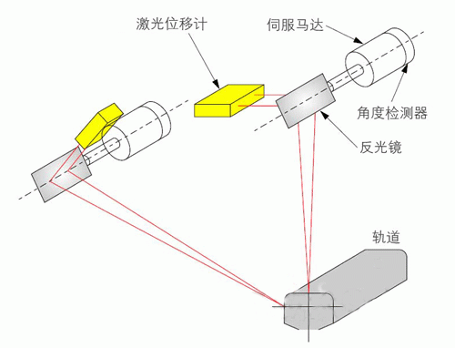 機構上帶有能通過伺服馬達改變方向的反光鏡,利用反光鏡來改變激光的方向(圖3)。利用激光位移計同時監測軌道反射回來的兩(liang) 束激光,根據位移情況來旋轉裝在伺服馬達軸上的反射鏡、調整激光的方向。具體(ti) 來說,就是通過頭頂麵的激光獲知上下方向的位移,由此調整側(ce) 麵激光的反射鏡的角度,從(cong) 而改變激光的高度。相反,通過側(ce) 麵激光可獲知橫向位移,由此調整向頭頂麵照射的激光的反射鏡。激光位移計的檢測與(yu) 激光方向的修正每隔1毫秒實施一次。可在上下±100mm、左右±150mm的範圍內(nei) 實施軌道位移檢測和激光跟蹤。