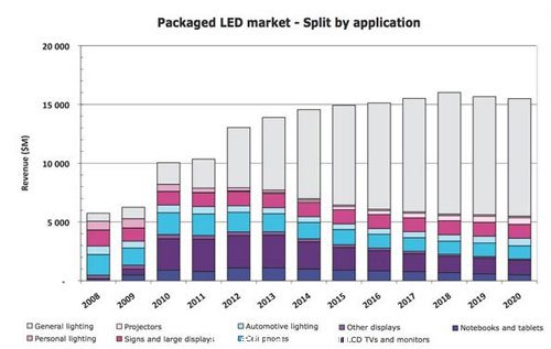 2012通用照明成為(wei) 最大的LED封裝應用領域,LED這種取代性技術將是增長趨勢延續到2018年。除了照明領域,其他LED應用市場也在快速發展。