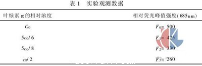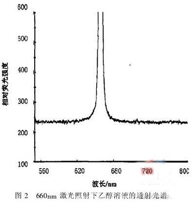 實驗具體(ti) 過程如下:用圖1所示實驗裝置先測得不放葉綠素樣品時乙醇溶液在激光照射下的透射光譜,如圖2所示;采集新鮮樹葉若幹,剪碎研磨後用高純度的無水乙醇5ml配成標準溶液,濃度記為(wei) c0,用相同實驗裝置測得該濃度下葉綠素α的熒光發射光譜,相對熒光峰值強度記為(wei) F0;然後逐步添加無水乙醇稀釋成6ml、8ml和10ml的三種不同濃度的溶液,稀釋後的溶液濃度依次記為(wei) 5c0/6、5c0/8和c0/2,用相同的方法分別測得不同濃度下對應的熒光發射光譜,相應的熒光峰值強度記為(wei) F1、F2和F3,測得熒光發射光譜和實驗中獲得的數據分別如圖3,表1所示: