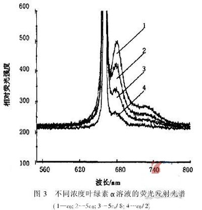 比較圖2,圖3可以看出,圖2隻有一個(ge) 峰(660nm),實際上是激勵光的光譜。兩(liang) 者區別在於(yu) 加入葉綠素樣品後在685nm附近明顯出現了一個(ge) 熒光峰,由此可以判斷其為(wei) 葉綠素α所產(chan) 生的熒光。由於(yu) 不同濃度的葉綠素α在685nm處均有一個(ge) 明顯的熒光發射峰,且峰值強度隨濃度的減小而降低;兩(liang) 者的具體(ti) 關(guan) 係通過分析表1中數據可看出,葉綠素α的相對熒光峰值強度與(yu) 其濃度近似成線性,這與(yu) 理論相吻合,因此可以通過獲取葉綠素α的熒光發射光譜來估算水體(ti) 中葉綠素α的濃度。