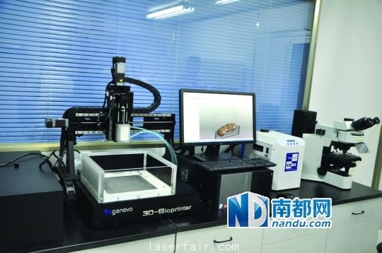 “R egenovo”上半部看起來像一台縫紉機,下半部是一個(ge) 方形的“盒子”。工作時,“縫紉機”上一根細細的類似縫衣針的噴頭,在下半部的盒子裏,前後左右移動,將含有活細胞的水凝膠一層一層堆疊成電腦為(wei) 它設定的立體(ti) 形狀,骨骼、血管、脂肪和肝組織都曾是它的作品。