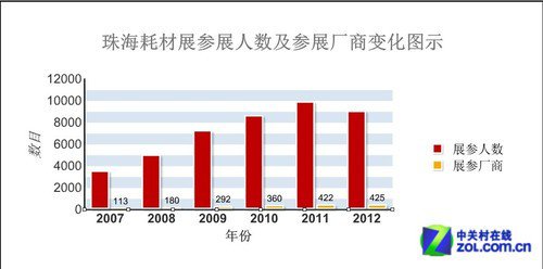珠海耗材展在2007年舉(ju) 辦的時候,隻有113位參展商,參展人數隻有3533人;到2012年的珠海耗材展上,參展商已有425位,參展人數已經達到9035人,這是一個(ge) 突破性的數字,這意味著在傳(chuan) 統打印市場,耗材問題備受關(guan) 注。