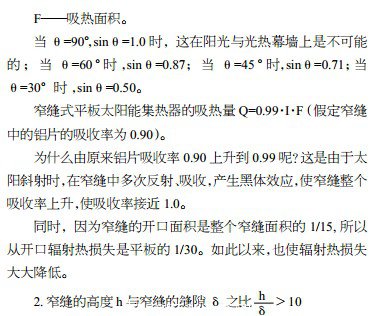 為(wei) 什麽(me) 由原來鋁片吸收率0.90上升到0.99呢?這是由於(yu) 太陽斜射時,在窄縫中多次反射、吸收,產(chan) 生黑體(ti) 效應,使窄縫整個(ge) 吸收率上升,使吸收率接近1.0。同時,因為(wei) 窄縫的開口麵積是整個(ge) 窄縫麵積的1/15,所以從(cong) 開口輻射熱損失是平板的1/30。如此以來,也使輻射熱損失大大降低。