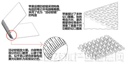 蘋果在美國申請的專(zhuan) 利(美國專(zhuan) 利申請號20130216740號)顯示,其基本構造之一如上麵最左邊的圖片所示。通過在希望板狀材料彎曲的地方切割無數的切口,可以使板具備彈性。這種構造叫做活動鉸鏈,在木工等領域屬於(yu) 比較常見的加工方法。