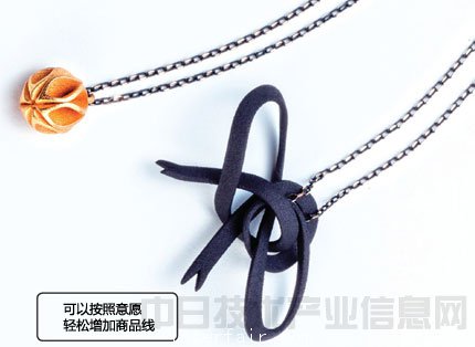 在飾品領域,使用3D打印機輸出成品銷售的動向正在不斷擴大。在福岡(gang) 設有事務所的設計團體(ti) “MONOCIRCUS”從(cong) 1年前開始銷售使用3D打印機製作的項鏈等飾品。價(jia) 格方麵,圖中黑色的飾帶為(wei) 3200日元,金屬項鏈為(wei) 3400日元。