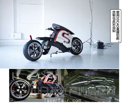 這輛摩托車的車架等主要部件使用切削機切削金屬製成。切削機準確地說並不是3D打印機,但是,這種機械直接根據3D數據加工形狀,無需模具的產(chan) 品化流程也是3D打印機備受期待的地方。