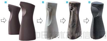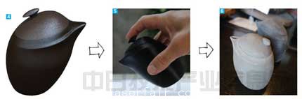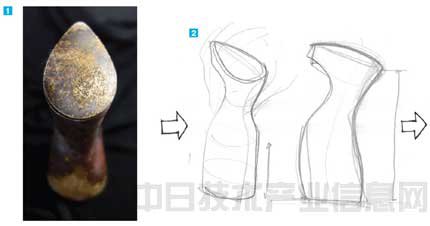 4 根據新繪製的草稿製作的渲染 5 3D打印機根據新製作的渲染輸出的實物模型。可以一定程度驗證使用感 6 為(wei) 根據3D打印機輸出的實物模型(後方)燒製試製品,備前燒陶吉方麵製作了陶胚(前方) |