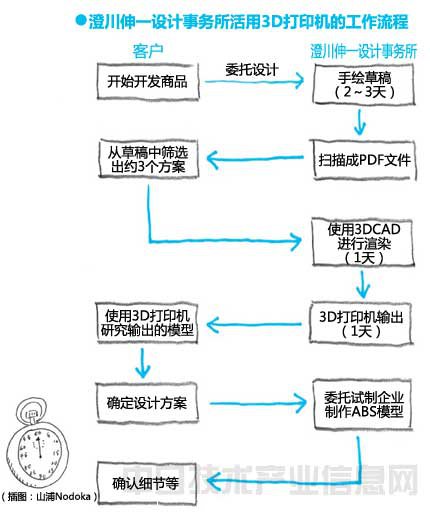 澄川向客戶提供設計時,采用的工作流程如下圖所示。除了使用手繪草稿、3DCAD和CG渲染、購置的3D打印機輸出的模型,以及委托試製企業(ye) 製作的模型驗證自身設計,3D打印機的用途還包括明確客戶的判斷、相互交流等。