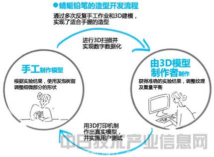 蜻蜓鉛筆稱,該公司先用3D掃描儀(yi) 使手工切削的發泡模型實現了數字數據化,然後使用名為(wei) “Freeform”的3D建模軟件進行表麵光滑處理。有時也要進行防滑等外觀處理。 該公司在造型開發中采用了使重量接近於(yu) 實際商品、同時用3D打印機重新輸出並進行實驗的流程。