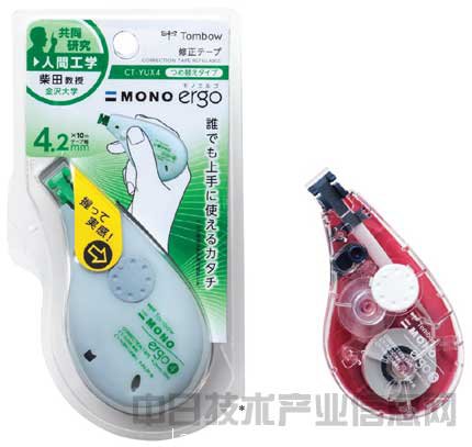 | 蜻蜓鉛筆的修正帶“MONO ergo”。為了讓此前不使用修正帶的人使用,開發商品時追求任何人都能熟練消去字跡的造型設計。 |