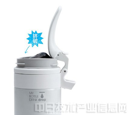 擠破 日本THERMOS公司和三得利共同開發的“MY BOTTLE DRINK drop”。將裝有飲料濃縮液的料包(左圖)放到專(zhuan) 用的容器上,用把手擠破倒出濃縮液。然後,注入水和熱水製成飲料 |