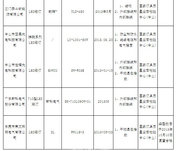2013年廣東(dong) 省LED路燈產(chan) 品質量專(zhuan) 項監督抽查不合格產(chan) 品及其生產(chan) 企業(ye) 名單