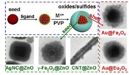 3、納米種子的分散與(yu) 聚集過程,研發出了一種將氧化鋅半導體(ti) 包裹在不同種子(包括金屬、氧化物、聚合物納米顆粒,氧化石墨烯以及碳納米管)表麵的普適方法。並且,這種方法不僅(jin) 局限於(yu) 以氧化鋅為(wei) 外殼,還適用於(yu) 以其他的氧化物或者硫化物為(wei) 外殼,比如Fe3O4, MnO, Co2O3, TiO2, Eu2O3, Tb2O3, Gd2O3, beta-Ni(OH)2, ZnS,以及CdS等,來合成複合物核殼納米結構。