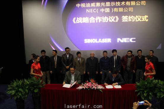 2013年12月3日14時,中視迪威激光顯示技術有限公司與(yu) NEC(中國)有限公司的《戰略合作協議》簽約儀(yi) 式在北京合生·麒麟社大地數字影院激光放映廳隆重舉(ju) 行。中視迪威激光顯示技術有限公司董事長季剛先生和NEC(中國)有限公司常務副總經理兼顯示產(chan) 品解決(jue) 方案事業(ye) 群總經理範欣先生分別代表兩(liang) 家公司在《戰略合作協議》上簽字。數碼辰星科技發展(北京)有限公司、北京航天長峰科技工業(ye) 集團、星光影視集團等二十餘(yu) 家中視迪威核心合作夥(huo) 伴負責人及二十多家新聞媒體(ti) 出席了儀(yi) 式,共同見證了本次簽約。