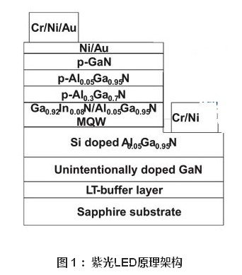 該390nm的紫光LED采用了類似的2μm n-AlGaN樣本作為(wei) 基底進行生產(chan) (如圖1)。有源發光多量子阱(MQW)包含了三對2.7nm的GaInN阱和12nm的 AlGaN障礙層。LED p層為(wei) 20nm的AlGaN電子阻擋層(electron-blocking、100nm的AlGaN電鍍層(cladding )和10nm的GaN觸點層。