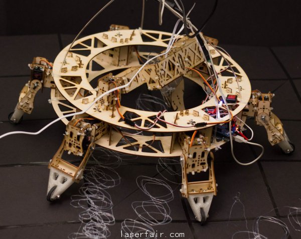 開發團隊有3名成員,Jia Wu、Mary Sek、Jeff Maeshiro,他們(men) 使用激光切割機和Type A 3D打印機製造了這款熱塑性3D打印機器人Geoweaver,六足、帶十二個(ge) 伺服器,可四處行走。
