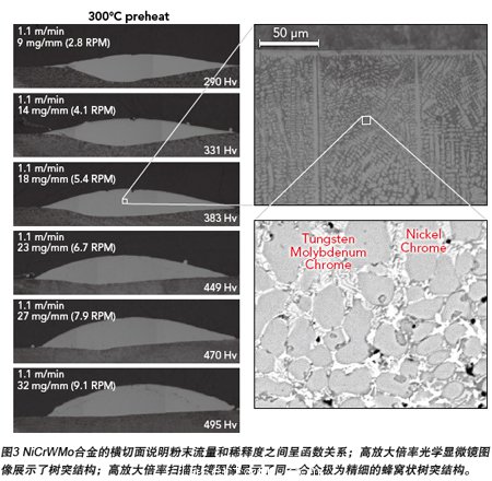 激光熔覆有許多相關(guan) 的技術參數,其中特別關(guan) 鍵的一個(ge) 是粉體(ti) 質量流量。對於(yu) 一種特定的應用來說,一旦確定了最佳的激光光斑直徑、熔覆速度和激光功率,便可利用粉體(ti) 質量流量來控製熔覆層的厚度、硬度和稀釋度,如圖3所示,我們(men) 可以看到,粉體(ti) 質量流量的增高可以有效地控製稀釋度。