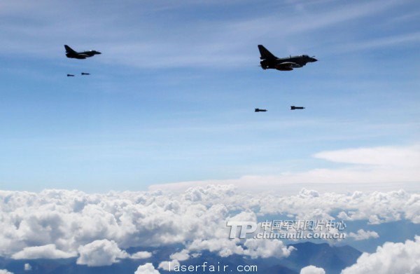 殲-10戰機編成突擊隊形,同時向地麵目標投送4枚激光製導炸彈,對重點目標實施精確打擊。(來源:中國軍(jun) 網 劉應華 攝)