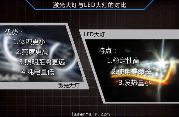 LED大燈憑借使用壽命長,節能的特點,正被多數廠商運用於(yu) 旗下車型中。隨著激光大燈技術的興(xing) 起,其在多方麵表現均超越LED大燈。激光大燈相比LED大燈的優(you) 勢在於(yu) ,其占空間將更小,這點有利於(yu) 車輛前部設計;另外更重要的是,激光大燈的照明效率提升70%(LED照明的光輸出約為(wei) 100流明/瓦,激光照明則約為(wei) 170流明/瓦),一般LED前燈大約耗電50瓦,而激光大燈可以將電能使用控製在30瓦以內(nei) 。另外激光大燈亮度是LED等的三倍,照明距離也將達到對方的兩(liang) 倍。