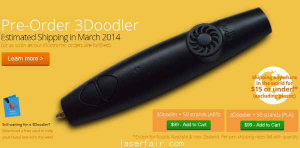 3Doodler去年在Kickstarter上舉(ju) 行了一次成功的募資活動,如今該公司已經完成了對Kickstarter上所有訂購用戶的發貨。據3D打印資訊門戶天工社了解,現在WobbleWorks又開始接受預訂,預計發貨日期是2014年3月。而3Doodler外圍配件的定價(jia) 和上市時間尚未最終確定,該公司希望能夠在今年春天出貨。