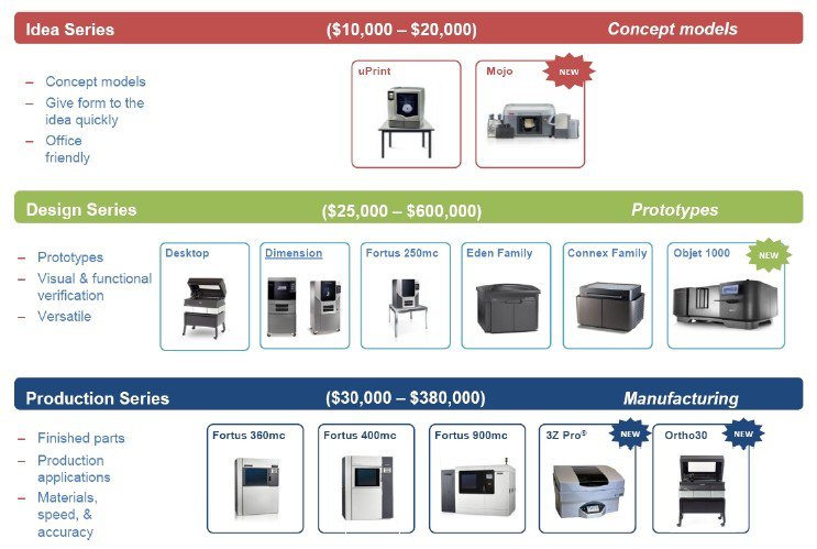 在收購MakerBot以前,Stratasys的產(chan) 品可分為(wei) 三大序列:(1)Idea係列,主要用於(yu) 概念模型,其單價(jia) 為(wei) 10,000~20,000美元,型號包括uPrint和Mojo;(2)Design係列,主要用於(yu) 原型製造,其單價(jia) 為(wei) 25,000~60,000美元,型號包括Desktop、Dimension、Fortus250mc、EdenFamily、ConnexFamily、Objet1000等;(3)Production係列,主要用於(yu) 製造過程,其單價(jia) 為(wei) 30,000~380,000美元,型號包括Fortus360mc、Fortus400mc、Fortus900mc、3ZPro、Ortho30等。