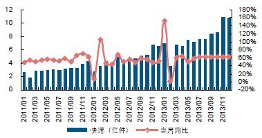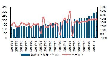 2013年,郵政企業(ye) 和全國規模以上快遞服務企業(ye) 業(ye) 務收入(不包括郵政儲(chu) 蓄銀行直接營業(ye) 收入)累計完成2547.8億(yi) 元,同比增長28.6%;業(ye) 務總量累計完成2725.1億(yi) 元,同比增長33.8%。