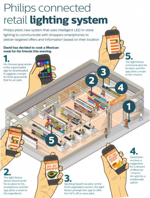 通過將藍牙通訊功能整合到LED燈具中,飛利浦的“智能燈泡”概念就此走紅。當然,智能燈泡不僅(jin) 能夠運用於(yu) 照明和烘托環境氛圍,也能夠找到另類(但卻有可能成為(wei) 主流)的商業(ye) 應用。在商店和娛樂(le) 場所的布置方麵,飛利浦也有自己的打算,那就是——通過可與(yu) 智能手機溝通的照明係統(藍牙通訊),實現基於(yu) 位置的服務——如室內(nei) 購物指引和導向等。