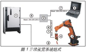 三維視覺係統主要由以下幾大部分組成,它通過ETHERNET IP協議與(yu) 機器人控製器進行通訊,連接方式如下圖所示。