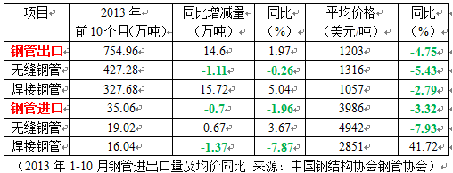 “2013年前10個(ge) 月鋼管進口盡管顯現量削價(jia) 跌態勢,但出口均價(jia) 照樣遠低於(yu) 進口均價(jia) ,鋼管的進口均價(jia) 是出口均價(jia) 的3.31倍。”鍾錫弟說。據悉,2013年1-10月鋼管入口754.96萬(wan) 噸,同比淨增14.6萬(wan) 噸,增幅1.97%;鋼管進口量35.06萬(wan) 噸,同比降0.7萬(wan) 噸,降幅為(wei) 1.96%;但鋼管出口均價(jia) 是1203美元/噸,進口均價(jia) 為(wei) 3986美元/噸,進口均價(jia) 是進口均價(jia) 的3.31倍。