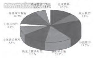 圖1是快速成形技術的主要應用功能的比例。它包括:①直觀展具:用於(yu) 工程師,設計師,工具製造者,建築師,醫學專(zhuan) 家與(yu) 用戶溝通交流的輔助工具;②展示模型:如地理信息係統模型;③功能模型;④裝配模型;⑤快速模具原型:如矽橡膠模具;⑥金屬鑄造模型;⑦工模具部件;⑧直接數字/快速製造:如定製化零件,替代物零件等。