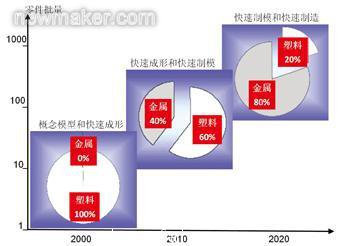 快速成形(Rapid Prototyping)技術出現於(yu) 上世紀80年代,它是基於(yu) 疊加製造(Additive Manufacturing)原理,根據零件三維模型數據直接將材料疊加堆砌在一起而形成實體(ti) 的技術。初期主要用於(yu) 塑料概念模型的製作,隨著各種不同快速成形技術的出現和材料的發展,它很快被用於(yu) 製造原型件和模具,開始在產(chan) 品整個(ge) 生命周期的各階段獲得了應用。預計到2020年,各種基於(yu) 快速成形的快速製造(Rapid Manufacturing)技術,特別是金屬零件的快速製造將會(hui) 有很大發展,如圖1所示。