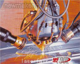 與(yu) 激光燒結成型機的區別在於(yu) :粉末不是存放在粉箱中,而是通過管道送到漏鬥式的供粉器中,金屬粉末隨著激光束一起,在熔融狀態下從(cong) 噴嘴射出並且按照軌跡堆砌成最終零件,是真正的疊加製造。因此,貴重的金屬粉末的需要量大為(wei) 減少,且零件的尺寸不受粉箱大小的限製,節省了加工費用。正在進行模具的表麵熔覆硬化處理的實況如圖4所示。