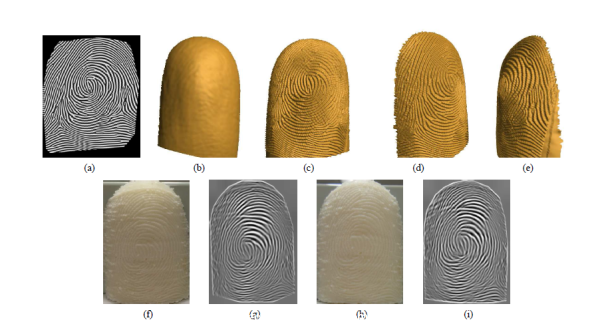 從(cong) 二維合成圖像到3D指紋替身:(a)樣本的2D合成指紋圖像;(b)通用的3D手指表麵;(c)正視圖;(d)左輪廓視圖和(e)映射創建的電子3D指紋“替身”;(f)和(h)是分別用800萬(wan) 像素和1600萬(wan) 像素相機拍攝的2D圖像生成3D指紋“替身”然後3D打印出來,(g)和(i)是(f)和(g)優(you) 化後的2D圖像。
