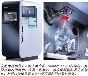 在此次K展上,除了傳(chuan) 統3D打印機製造商如Stratasys和EOS參展,全球領先的注塑機廠商—德國阿博格公司發布的3D打印機尤其引起了業(ye) 界的高度關(guan) 注,這也是全球範圍內(nei) 塑料加工企業(ye) 首次涉足3D打印技術領域。這款名為(wei) Freeformer的機器基於(yu) 增材製造技術的最新工藝—阿博格塑料無模成形技術(AKF-Arburg Plasstic Freeforming)。