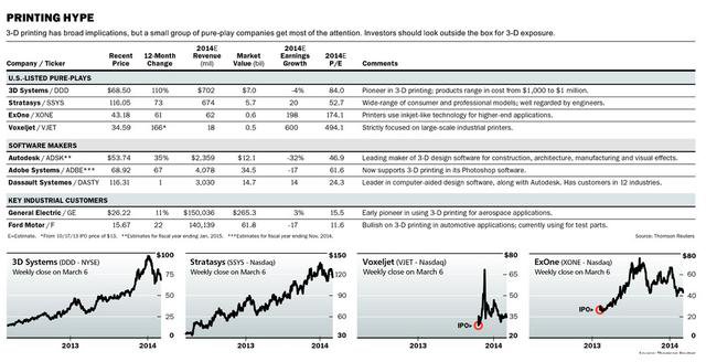 在這股風潮來臨(lin) 之前,華爾街一直早有準備。作為(wei) 3D打印市場最大的一支個(ge) 股,3D Systems的股價(jia) 在過去兩(liang) 年裏上漲了3.7倍,而另一支個(ge) 股Stratasys的股價(jia) 也在同期上漲了2.31倍。而在2013年申請IPO上市的另外兩(liang) 家3D打印公司ExOne和Voxeljet的股價(jia) 至今也分別上漲了1.4倍和1.66倍。上述每一家3D打印公司的業(ye) 務重點都略有區別,比如3D Systems越來越靠近消費類產(chan) 品,而Voxeljet則緊緊抓住了大規模產(chan) 業(ye) 3D打印機市場。