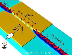 其內(nei) 部結構為(wei) 平行排列的兩(liang) 個(ge) 微小黃金電極,長度約29微米,兩(liang) 電極之間的間隙約為(wei) 0.1微米,整個(ge) 結構直徑不到人頭發的1/3,兩(liang) 電極之間引入變化的電壓信號,其頻率與(yu) 傳(chuan) 輸的數據信號相關(guan) ,在電極中間充填有特殊的塑料材料,其對光線的折射率隨所施加的電壓發生改變。在兩(liang) 電極的間隙中導入連續光束後,會(hui) 激發出表麵電磁波(表麵等離子體(ti) ),這種表麵電磁波受到施加與(yu) 電極間隙中充填的塑料材料中的電壓信號的調製,而經過調製的表麵電磁波又可影響穿過間隙的光束的相位,實現信息通過施加於(yu) 兩(liang) 電極的電壓信號調製光束而轉換成光信號在光介質中的傳(chuan) 輸。