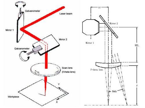 一束激光被兩(liang) 片掃描振鏡反射,並且通過一片聚焦鏡。振鏡片在一個(ge) galvo-掃描器馬達的帶動下高速的來回延軸旋轉。在大多數情況下,最高偏轉角鏡是+12.5°(+10°往往是一個(ge) 較安全範圍)入射角不能偏於(yu) 45°。