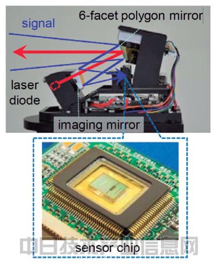 此次豐(feng) 田中研使用的試製係統以6麵反射鏡來掃描波長為(wei) 870nm的激光(圖1)。該反射鏡既可將激光二極管的光向周圍發射,還可用於(yu) 將對象物的反射光導入受光元件(光二極管)的光路控製。