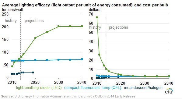 LED燈、日光燈與(yu) 白熾燈燈泡效率與(yu) 價(jia) 格走勢預估