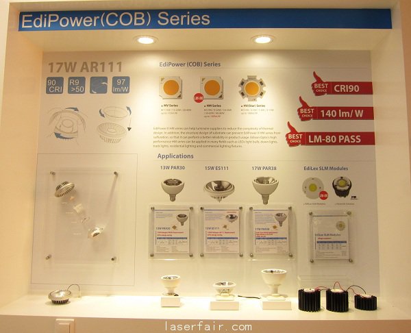 艾笛森在COB領域投入的時間相當早,近年來許多照明客戶對光型的要求越來越高,因此COB這種LED模塊,在Down Light等應用市場,已經成為(wei) 主流選項,並廣為(wei) 被客戶接受。艾笛森於(yu) 2013年推出高光效EdiPower II HM係列產(chan) 品便廣受市場重視。該公司推出的COB產(chan) 品,規格範圍從(cong) 5W~40W不等,都有相對應用與(yu) 市場性。目前HM09、 HM30產(chan) 品已經通過了LM80的認證,HM 40也即將通過LM 80,這是業(ye) 界少數通過LM 80的大瓦數COB產(chan) 品。而在演色性上,冷白色係的LED產(chan) 品,其CRI已經可以高於(yu) 90,暖白色係的LED產(chan) 品,其CRI更可超過95,最高光效也可達 140LM/W,相當具有競爭(zheng) 力,可以滿足對商用空間照明有高度要求的國際級客戶。