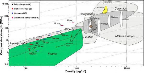通過借鑒骨頭、木頭、以及蜂巢的框架結構,德國研究人員已經開發出了一種輕質的高強度材料。利用3D激光聚合物打印技術、並結合陶瓷塗層,研究人員成功打造出了密度小於(yu) 水、但是機械性能堪比高性能鋼或鋁的新材料。