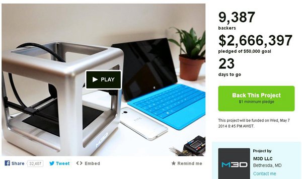 上周3D打印行業(ye) 的明星毫無疑問應該是一台名為(wei) Micro的消費級3D打印機。2014年4月7日,這款小巧的3D打印機剛開始在眾(zhong) 籌平台Kickstarter上的募款目標隻有微不足道的5萬(wan) 美元。但令人驚訝的是,這個(ge) 目標在其剛上線不到11分鍾即告突破。不過令人吃驚的還在後麵,2014年4月14日,差不多一周時間,Micro 3D打印機的募集資金已經達到了驚人的260萬(wan) 美元!