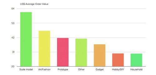 3D打印物品平均訂單金額(數據來源:3dhubs.com)