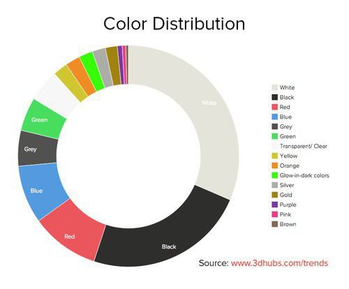 白色和黑色材料還是使用最多的材料顏色,白色占到31.5%,黑色占到23.6%。而透明、半透明材料占到了4.7%的比例,夜光材料占到了2%的比例,有越來越多的人使用這兩(liang) 種顏色的材料。